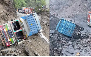 नरायणघाट–मुग्लिन सडकमा गएको पहिरोका कारण ट्रक पल्टियो, बाटो पुनः अवरुद्ध