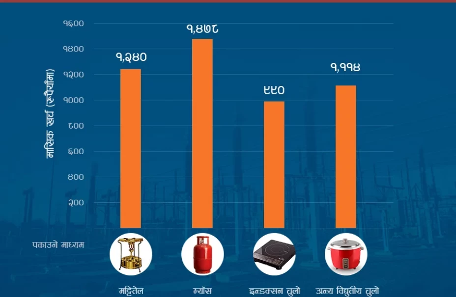 उक्त अध्ययनले सन् २०१९ मा नेपाल विद्युत् प्राधिकरणले तोकेको बिजुलीको विद्यमान मूल्यअनुसार, ५ जनाको परिवारले १५ एम्पियरको विद्युत् महसुल अनुसार खाना बनाउन मट्टितेल प्रयोग गरियो भने मासिक १२ सय ४० रुपैयाँ खर्च हुने देखाएको थियो । त्यस्तै अहिले अत्यधिक प्रयोग भइरहेको एलपी ग्यासमा ५ जनाको परिवारलाई खाना बनाउँदा एक महिनामा १४ सय ७८ रुपैयाँँ खर्च हुन्छ । तर बिजुलीको जुनसुकै माध्यमबाट ५ जनाको परिवारलाई खाना पकाउँदा ११ सय १४ रुपैयाँ मात्रै खर्च हुने देखिएको छ ।