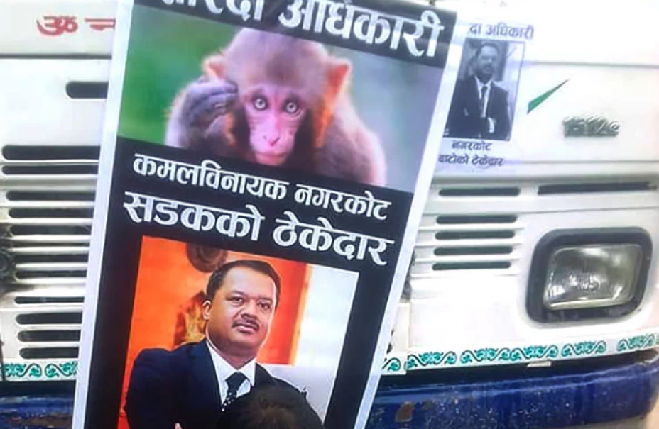(काठमाडौं) नगरकोट त्यसआसपासका विभिन्न सार्वजनिक स्थान र त्यहाँ चल्ने सवारीहरुमा ठेकेदार शारदाप्रसाद अधिकारीका फोटो टाँसिएका छन्, कतिपय फोटोका माथिल्लो भागमा कुुकुर र बाँदरका तस्वीर समेत जोडिएका छन् ।