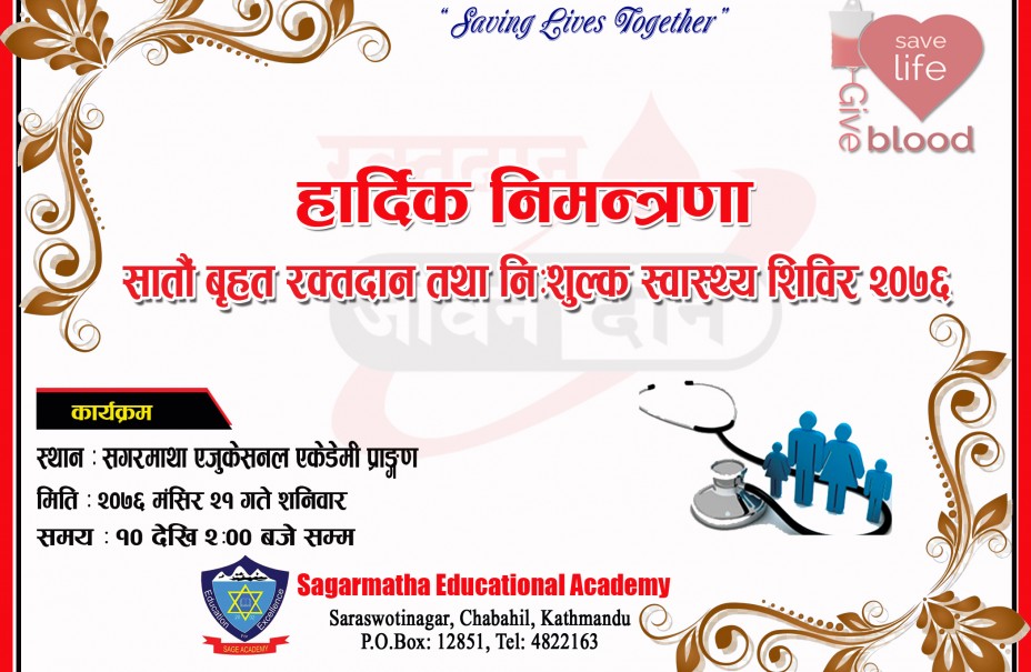 यो आउँदै गरेको मंसिर २१ गते शनिबार सागरमाथा एजुकेशनल एकेडेमी र लायन्स अफ ओखलढुङगाको संयुक्त आयोजनामा सञ्चालन हुन लागीरहेको वृहत रक्तदान तथा नोबेल अस्पतालको वरिष्ट चिकित्सहरुद्धारा परीक्षण हुने स्वास्थ्य शिविर मा उपस्थित भई लाभ लिन हुन सबै जनसमुदायमा आयोजक हार्दिक अनुरोध गर्दछ । उक्त कार्यक्रममा करिव २००० जना बिरामिको नि:शुल्क स्वास्थ्य परीक्षण गरिने तथा १५० प्रिन्ट रक्त सङकलन हुने अनुमान गरिएको विद्यालयको प्रिन्सिपल पुष्पराज सिंखडाले बताउनु भयो।