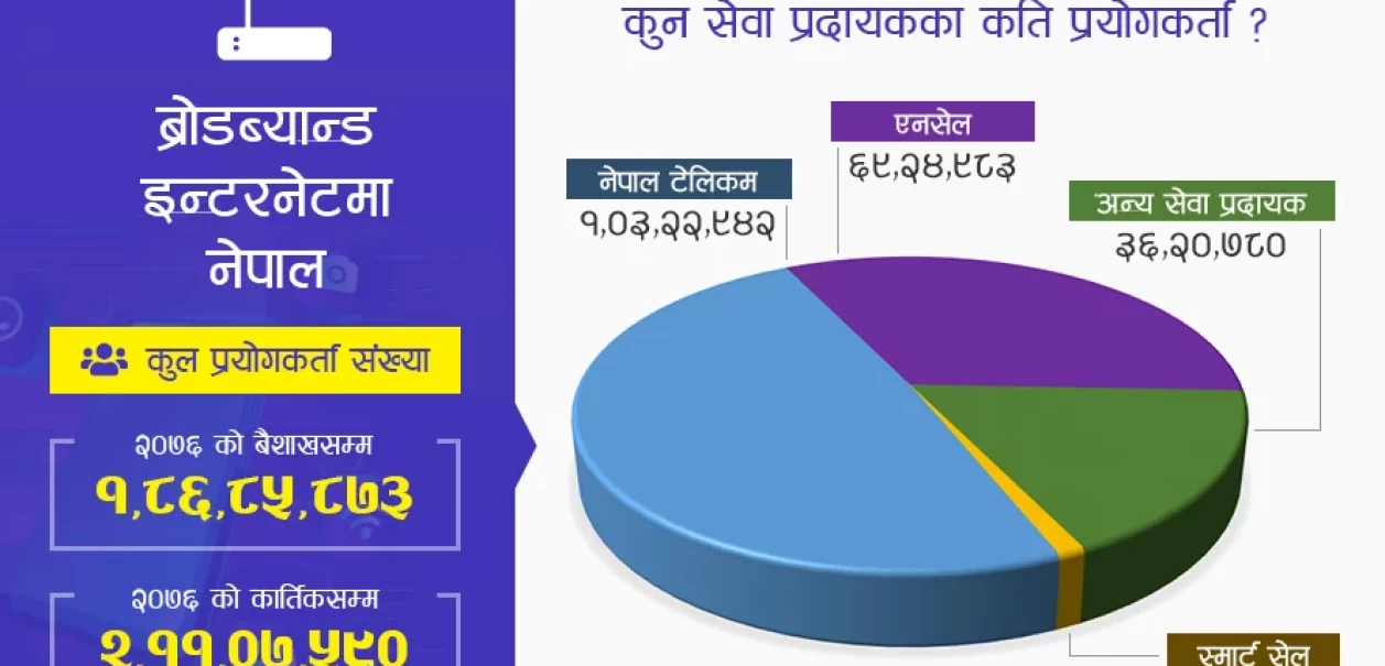 यसैगरी थ्रीजी र फोरजी सेवा मात्रै दिइरहेको एनसेलसँग ६९ लाख २४ हजार इन्टरनेट प्रयोगकर्ता छन् । स्मार्ट टेलिकमले पनि २ लाख ३८ हजारलाई मोबाइलबाटै फोरजी इन्टरनेट सेवा दिँदैछ । आईएसपीहरुले वाइफाइ र एफटीटीएच गरी ३५ लाख २८ हजार प्रयोगकर्ता बनाएका छन् ।
