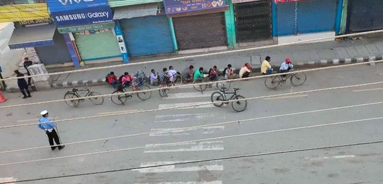 लकडाउनमा साइकल चलाउने १२ जनालाई प्रहरीले ‘मुर्गा’ बनायो