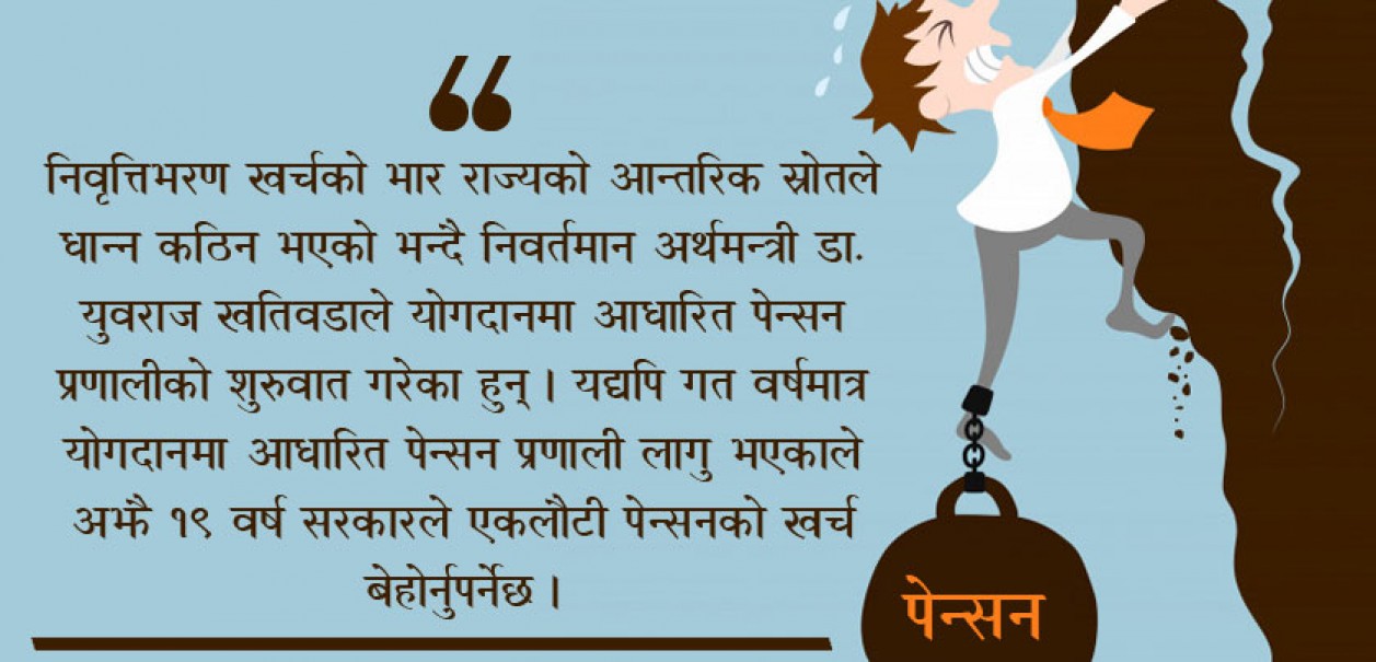 निवृत्तिभरण खर्चको भार राज्यको आन्तरिक स्रोतले धान्न कठिन भएको भन्दै निवर्तमान अर्थमन्त्री डा. युवराज खतिवडाले योगदानमा आधारित पेन्सन प्रणालीको शुरुवात गरेका हुन् । यद्यपि गत वर्षमात्र योगदानमा आधारित पेन्सन प्रणाली लागु भएकाले अझै १९ वर्ष सरकारले एकलौटी पेन्सनको खर्च बेहोर्नुपर्नेछ ।