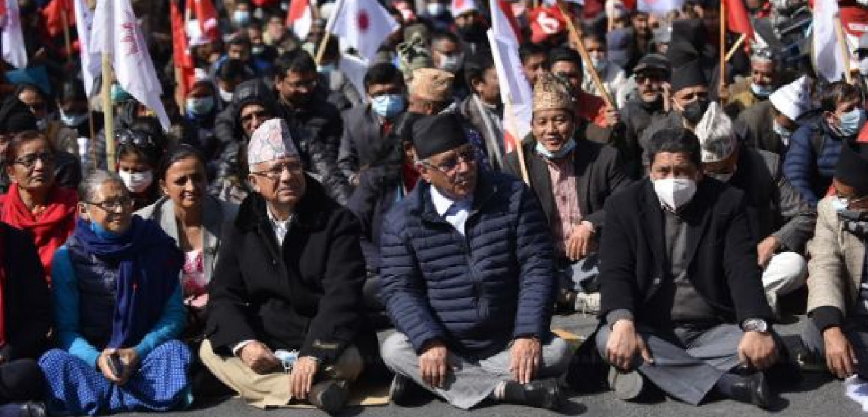 नेपाल कम्युनिष्ट पार्टीको प्रचण्ड-नेपाल समूहका अध्यक्ष पुष्पकमल दाहाल 'प्रचण्ड' र माधवकुमार नेपाल आइतबार माइतीघरमा धर्ना बसेका छन्।