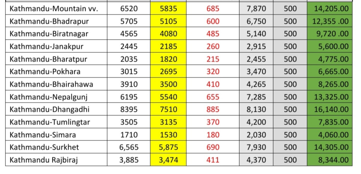 काठमाडौंबाट भैरहवाका लागि ४१०, नेपालगन्जमा ६५५, तुम्लिङटारका लागि ३७०, सिमराका लागि १८० , सुर्खेतका लागि ६९० र राजविराजका लागि ४११ रुपैयाँ भाडा कम भएको छ ।