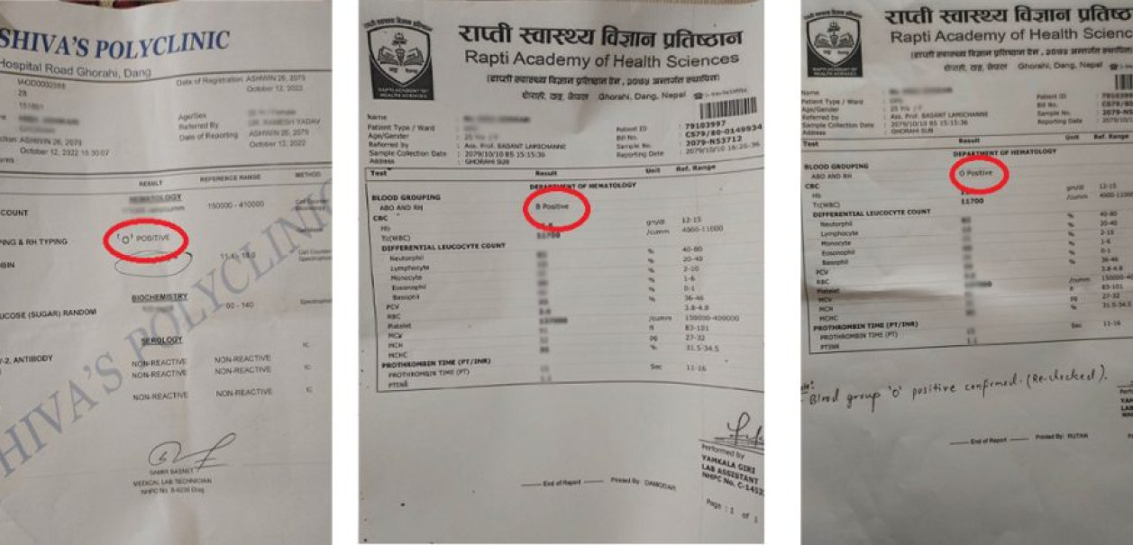 ‘श्रीमती सुत्केरी हुँदा रगत चढाउनुपर्ने बेला दुई फरक ब्लड रिपोर्ट आएपछि अन्योलमा परें’ अधिकारीले भने, ‘दोस्रो पटक रगत जाँच गर्दामात्र प्रतिष्ठानले लापरबाही गरेको कुरा थाहा भयो ।’