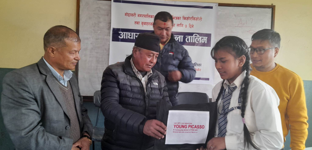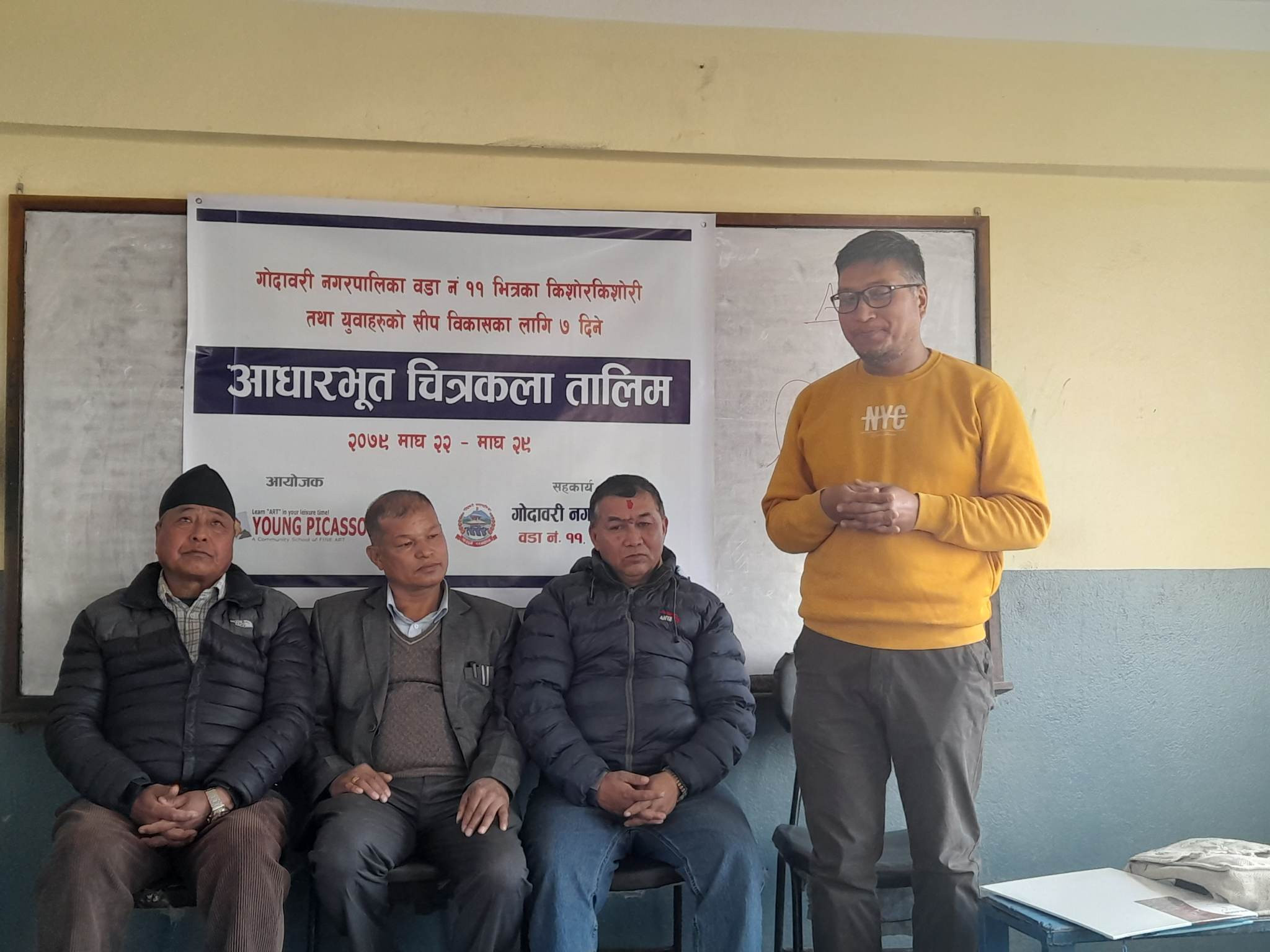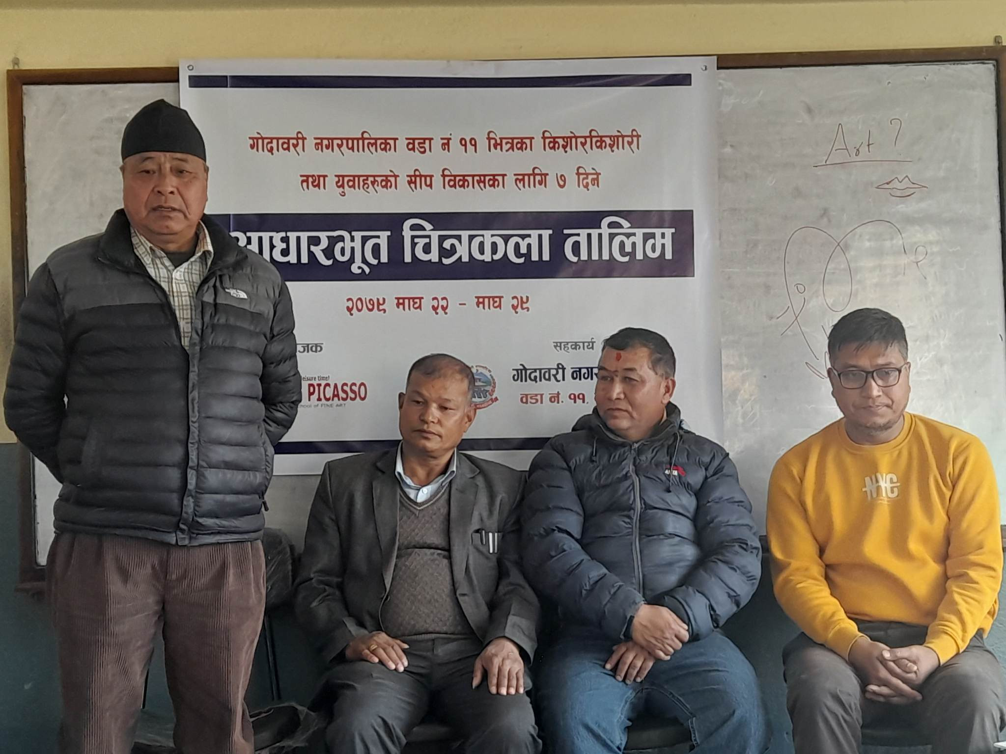 गोदावरी नगरपालिका वडा नं ११ चापागाउँमा आधारभुत चित्रकला तालिम शुरु भएको छ । योङ पिकासो अ कम्युनिटी स्कुल अफ फाइन आर्टको आयोजना तथा सो वडाको सहकार्यमा वडा भित्रका किशोरकिशोरी तथा युवाहरुको सिप विकासका लागि आइतबारदेखि आउँदो आइतबारसम्म उक्त काम शुरु भएको हो । वडाध्यक्ष नीलबहादुर देशारले चित्रकलामार्फत आफूहरुले वडावासीलाई राष्ट्रका साथै अन्तरराष्ट्रिय रुपमा अघि बढाउने योजना अनुरुप उक्त कामलाई अघि बढाएको भनाइ राख्नुभयो । उहाँले भन्नुभयो, “ चित्रकलाले मानिसको सोचलाई उजागर गर्ने भएकाले यसले लुकेको प्रतिभालाई बाहिर ल्याउन सहयोग गर्नेछ ।