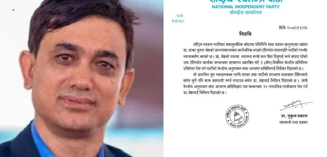 राष्ट्रिय स्वतन्त्र पार्टीले समानुपातिक सांसद डा. ढाकाकुमार श्रेष्ठलाई २४ घण्टे स्पष्टीकरण सोधेको छ । श्रेष्ठले मेडिकल व्यवसायी दुर्गा प्रसाईँसँग मन्त्री बन्न दुई करोड रकम चाहिने भन्दै प्रसाईँसँग २ करोड रुपैयाँ मागेको अडियो आइतबार सार्वजनिक भएपछि उनलाई पार्टीले २४ घण्टे स्पष्टीकरण सोधेको हो ।