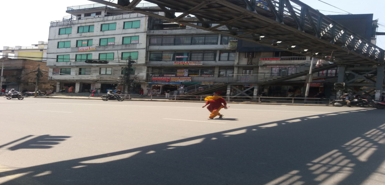 फैदल यात्रीलाई बाटो काट्न सहज होस् र दुर्घटना नहोस् भन्ने उद्देश्यले काठमाडौँका बिभिन्न चोकमा आकाशेपुल निर्माण भएको छ । तर फैदल यात्रीहरुको चेतनाको स्तर कम भएर भनैँ, वा लार्पवाहि ? हेर्दा शिक्षित देखिने मान्छेहरुले नै आकाशे पुल हुँदा हुँदै पलकै मुनिबाट बाटो काटेपछि अन्य साधारण फैदल यात्रीहरुले के सिक्ने ? चाबहिल चोकमा एक व्याक्तीले बाटो काट्दै ।