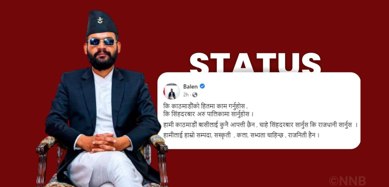समाजिक सञ्जाल फेसबुकमा स्टाटस् लेख्दै उनले काठमाडौंको हितमा काम नगर्ने सिंहदरबार अर्को पालिकामा सार्न भनेका छन् । सिंहदरवार अर्को पालिकामा सार्दा काठमाडौंका स्थानीयलाई कुनै फरक नपर्ने मेयर बालेनको दाबी छ ।