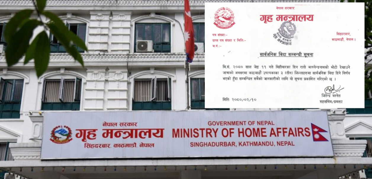 ‘वि.सं.२०८० साल जेष्ठ ११ गते बिहीबारका दिन रातो मत्स्येन्द्रनाथको भोटो देखाउने जात्राको अवसरमा काठमाडौं उपत्यकाका ३ जिल्लाहरूमा सार्वजनिक बिदा दिने निर्णय भएको हुँदा सम्बन्धित सबैको जानकारीको लागि यो सूचना प्रकाशित गरिएको छ ।’सूचनामा भनिएको छ ।