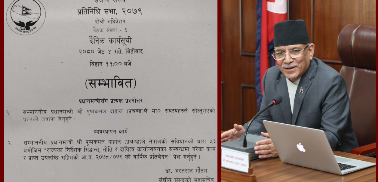 संघीय संसद सचिवालयका महासचिव डा. भरतराज गौतमले बुधबार सार्वजनिक गरेको सम्भावित कार्यसूचीअनुसार बिहीबार बस्ने प्रतिनिधिसभा बैठकमा प्रधानमन्त्री प्रचण्डले सांसदहरुले सोधेको प्रश्नको जवाफ दिने उल्लेख गरिएको हो ।