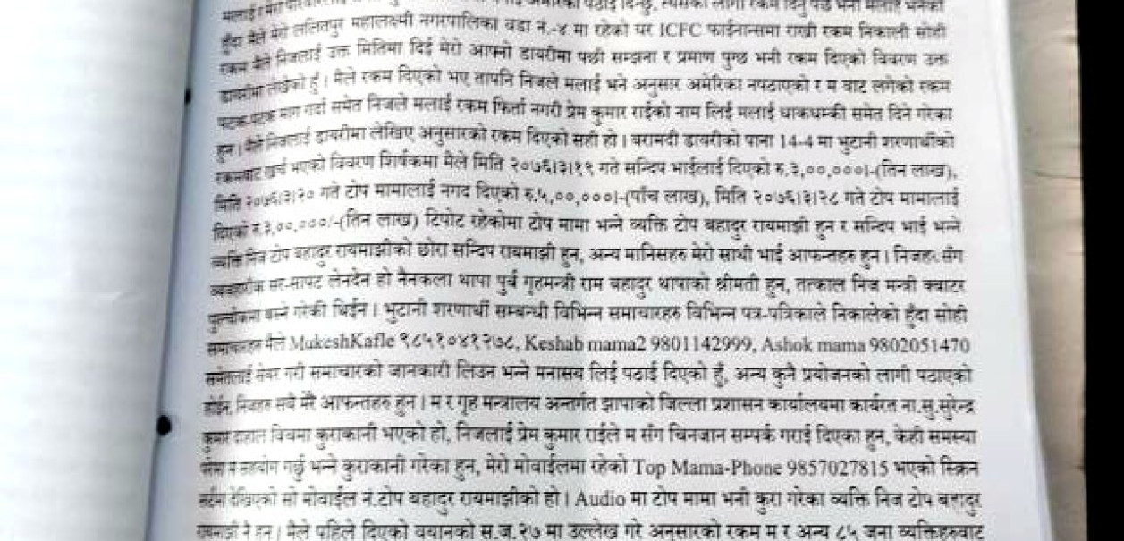 –तत्कालीनऊर्जामन्त्रीटोपबहादुररायमाझीकाप्रमुखस्वकीयसचिवलीलाजिसीलेप्रधानन्त्रीकोमापैसापुगिसक्यो, सामाजिकविकाससमितिबाटभुटानीशरणार्थीकोविषयनिर्णयगर्नुपर्नेरहेछउर्जामन्त्रीज्यूरमलाईपनिरकमचाहियोभनीउर्जामन्त्रीकोक्वाटरपुल्चोकमाबोलाईसामाजिकविकाससमितिबाटनिर्णयभएकोअघिल्लोदिनबेलुकाएककरोडनगदैबुझीलिएकाहुन्।