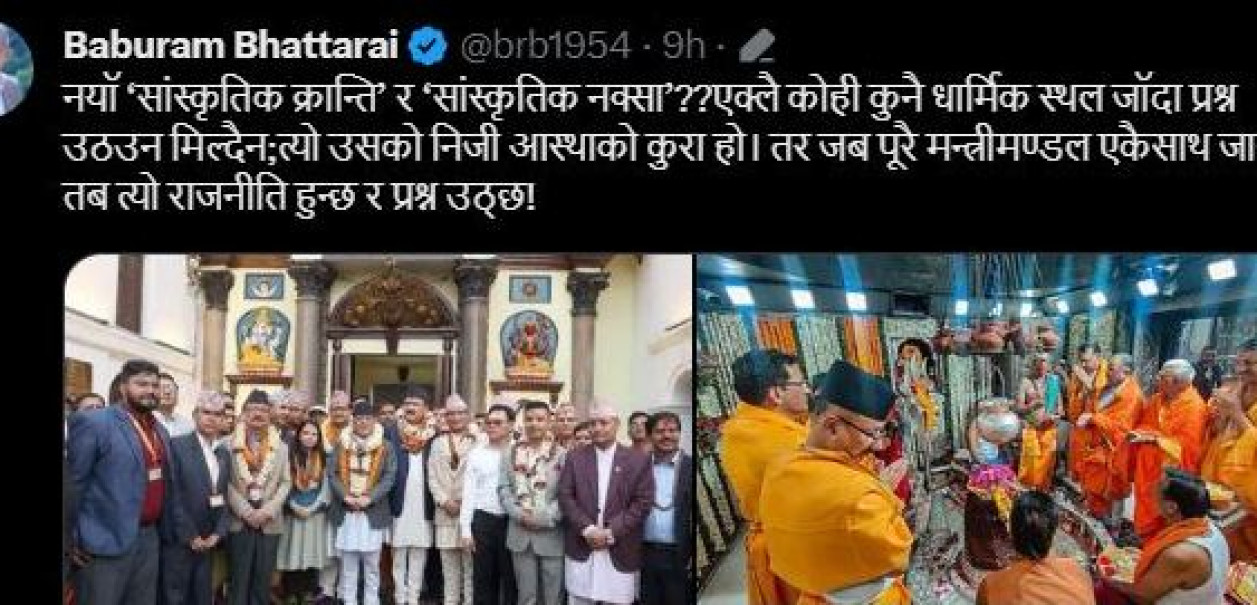 काठमाडौं । नेपाल समाजवादी पार्टीका अध्यक्षएवम् पूर्व प्रधानमन्त्रीडा.बाबुराम भट्टराईले मन्त्रिपरिषद्का सदस्यहरू एकसाथधार्मिक स्थलमागएको भन्दै प्रश्न उठाएका छन्।