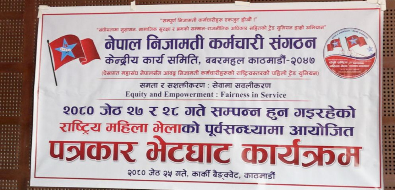 नेपालनिजामतीकर्मचारी संगठन, केन्द्रीयकार्य समितिको आयोजना र केन्द्रीयमहिलाविभागको व्यवस्थापनमाहुनगएको राष्ट्रिय महिला भेलाको पूर्वसन्ध्यामापत्रकार सम्मेलनको आयोजनागर्दै उक्तजानकारी गराइएको हो ।
