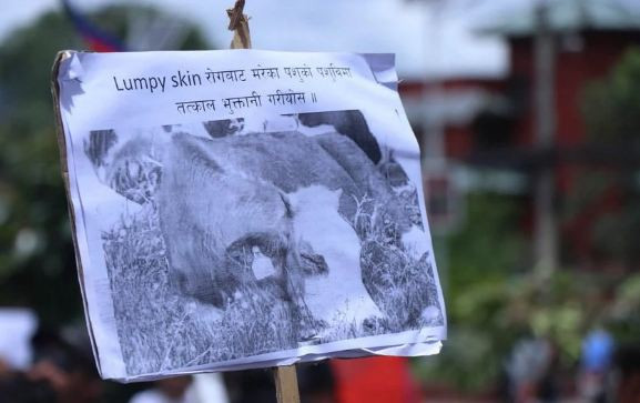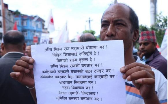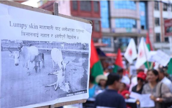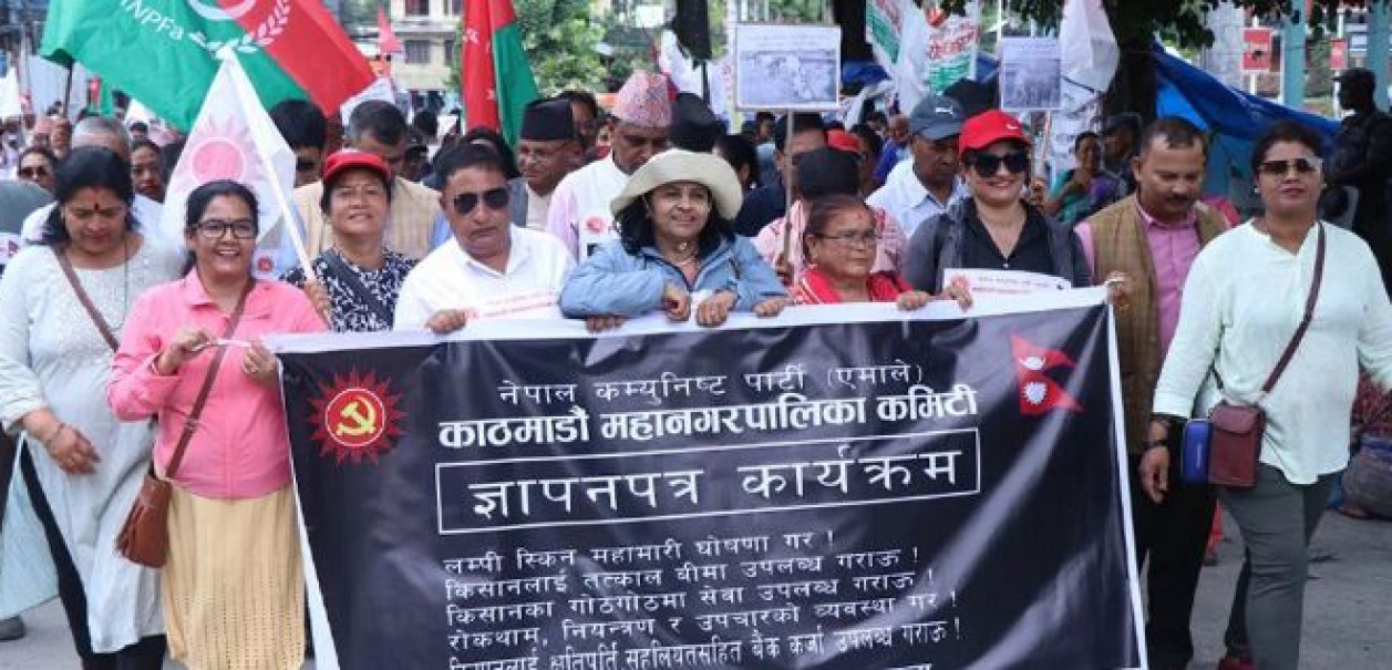 नेकपा एमालेले लम्पी स्किन रोगलाई महामारी घोषणा गर्न सरकारलाई दबाब दिँदै प्रदर्शन गरेको छ । एमाले काठमाडौँ महानगरपालिका कमिटीले बुधबार सो रोगलाई महामारी घोषणा गर्न र रोगबाट प्रभावित किसानलाई तत्काल क्षतिपूर्ति उपलव्ध गराउन माग गर्र्दै माइतीघर मण्डलामा प्रदर्शन गरेको हो ।