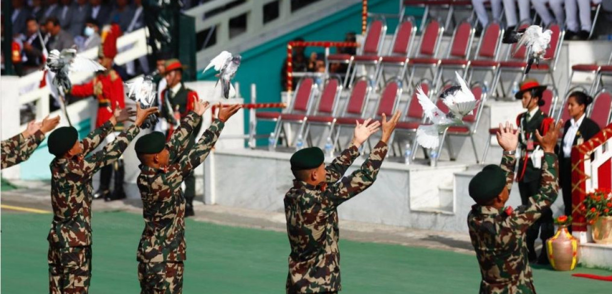 त्यस्तै मैदानबाट रङ्गीचङ्गी बेलुन र शान्तिका दूत परेवा उडाइनुका साथै नेपाली सेना, नेपाल प्रहरी र सशस्त्र प्रहरी बलका विभिन्न टोलीबाट मार्चपास तथा सांगितिक प्रस्तुति गरिएको थियो।